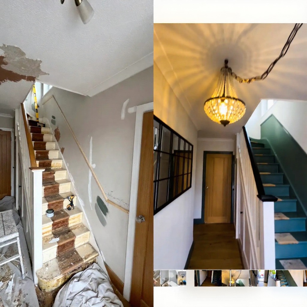 A hallway in need of modernization was refurbished and redecorated to create a fresh and inviting space.